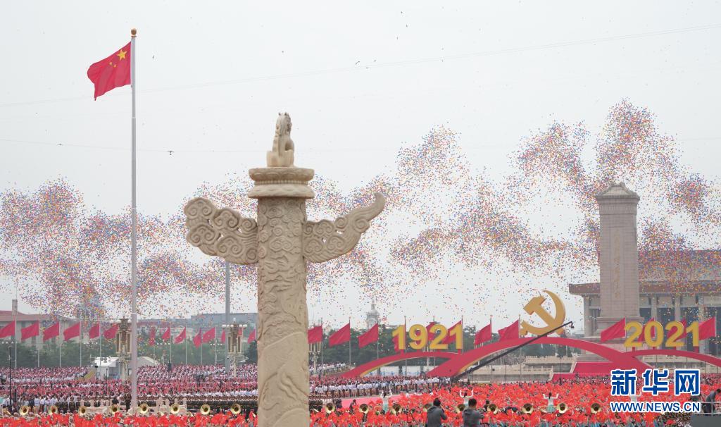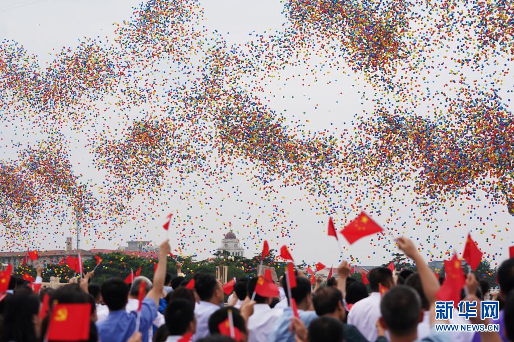 7月1日上午,庆祝中国共产党成立100周年大会在北京天安门广场隆重举行。这是庆祝大会现场放飞气球。