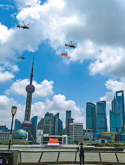 7月1日,3架直升机悬挂党旗飞过上海外滩上空,庆祝中国共产党成立100周年。影像中国