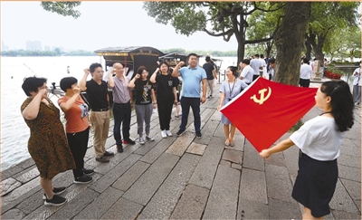 7月1日,在浙江嘉兴南湖红船旁,党员重温入党誓词。王 刚摄(影像中国)