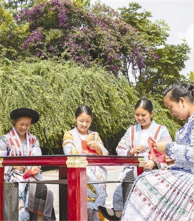 7月1日,贵州黔西新仁苗族乡化屋村群众唱红歌、绣党旗,庆祝中国共产党成立100周年。史开心摄(人民视觉)