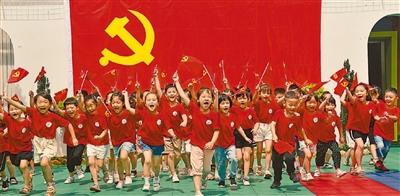 7月1日,浙江台州仙居县迎晖幼儿园开展“党旗在我心中”主题教育活动,小朋友一起唱革命歌曲、与党旗合影。 王华斌摄(人民视觉)