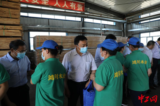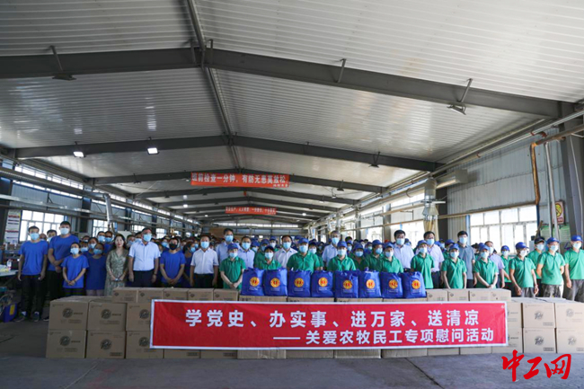 中工网讯 7月10日,中华全国总工会、内蒙古自治区总工会以及呼伦贝尔市总工会干部来到满洲里市开展关爱农牧民工送清凉专项慰问活动,为满洲里送去10万元送清凉资金,在满洲里鸿利木业有限责任公司现场为200余名农牧民工送去“清凉大礼包”。