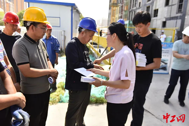 活动现场,慰问组同一线建筑工人们亲切交谈,了解他们的工作生活情况,并为他们送上绿豆、矿泉水、洗护套装等防暑慰问品,嘱咐他们要注意防暑,安全工作。
