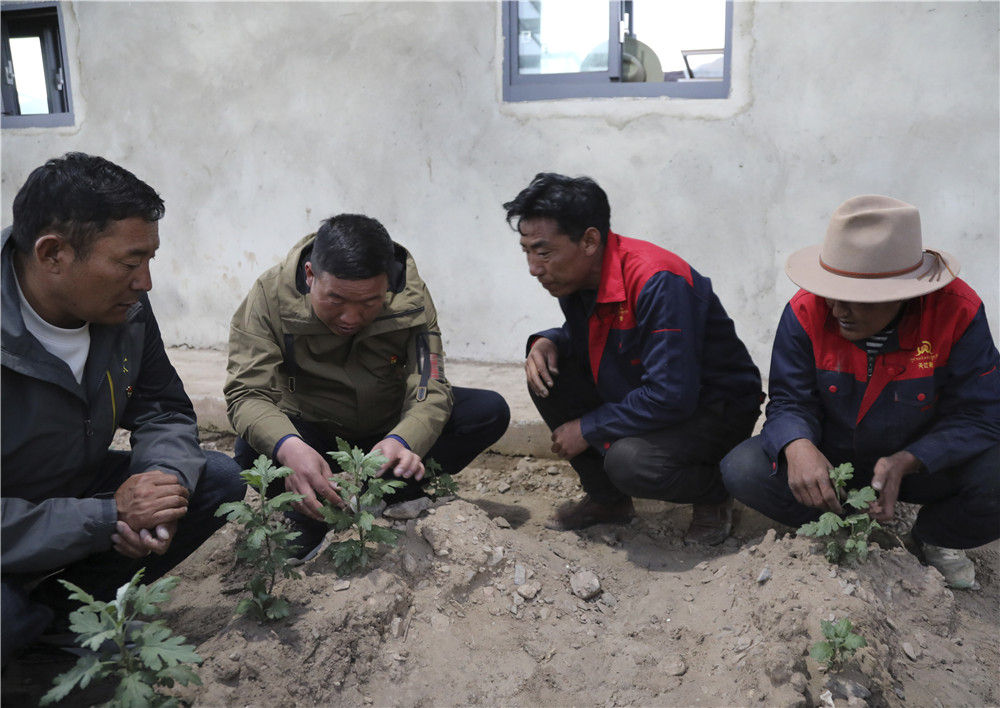 西藏日喀则市岗巴县岗巴镇党委书记李明阳(左二)在贡菊大棚了解秧苗的培育情况(2019年4月15日摄)。新华社发