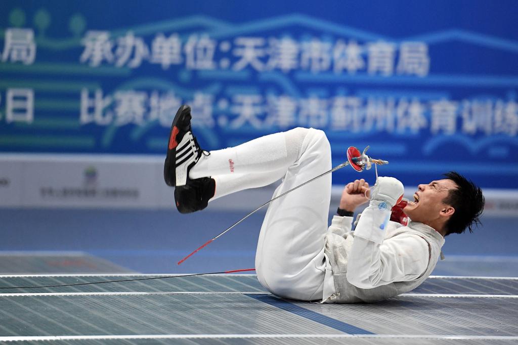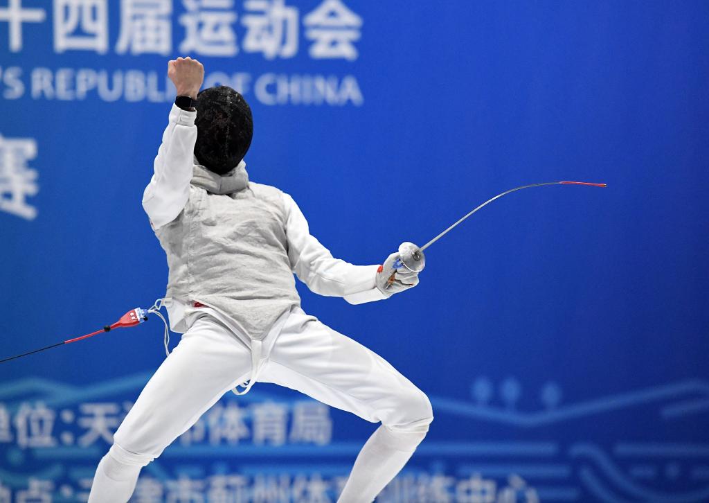 当日,在天津市蓟州体育训练中心举行的击剑项目男子花剑团体决赛中,福建队以45比40战胜广东队,夺得冠军。