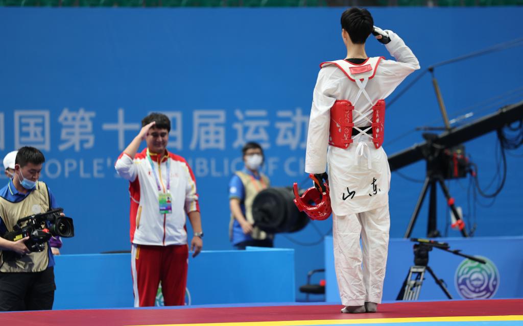 9月23日,山东队选手梁育帅(右)在比赛后对教练员敬礼。
