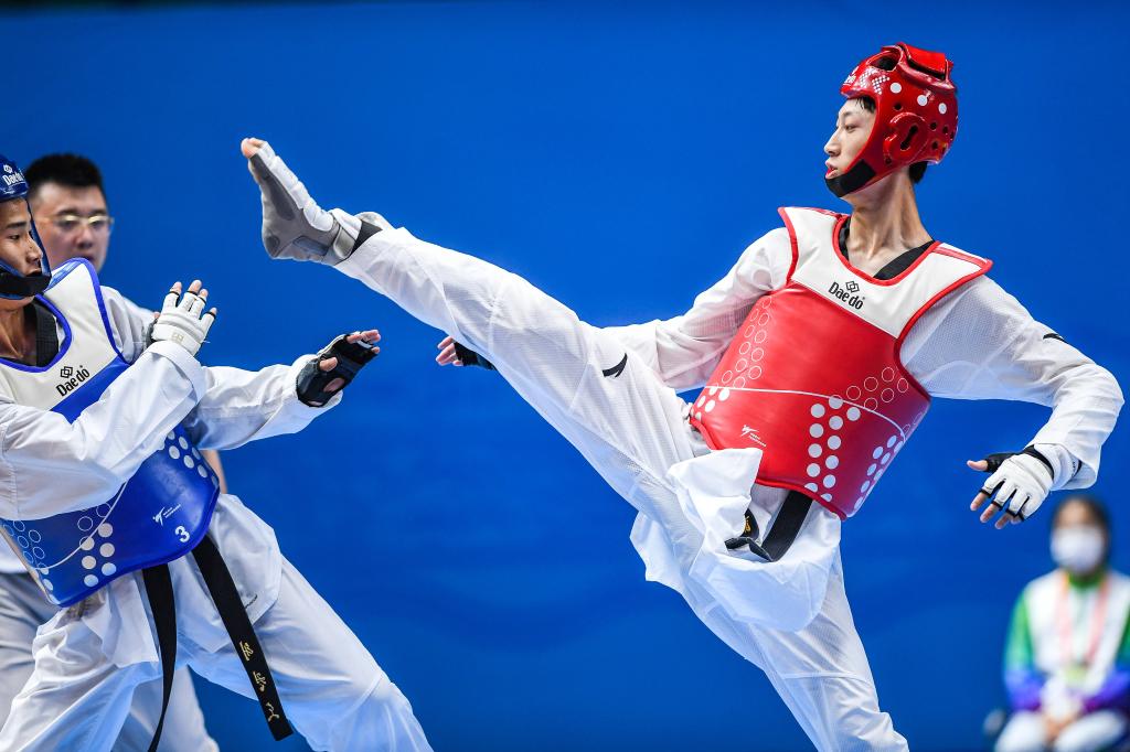 当日,在陕西汉中举行的第十四届全运会跆拳道项目男子58公斤级决赛中,山东队选手梁育帅以总比分17比10战胜江苏队选手王余龙,获得金牌。
