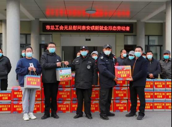 扬州市总工会先后深入杭集镇、泰安镇进行慰问,为新就业形态劳动者送去工会组织的温暖与关怀,共赠送温暖物资50 份。