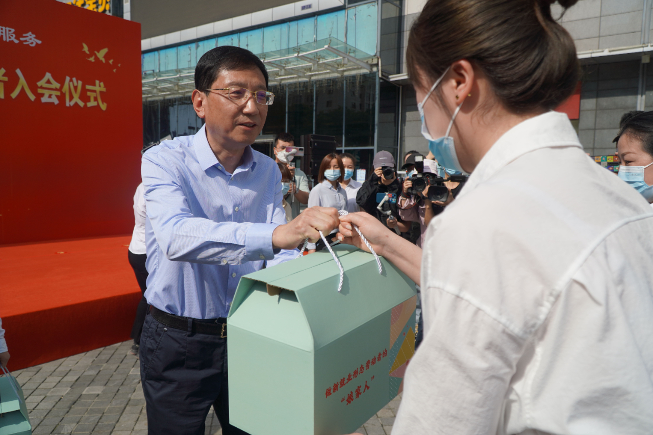 仪式现场,与会领导为新入会会员代表颁发了《中国工会会员证》,发放了300份“爱心大礼包”。