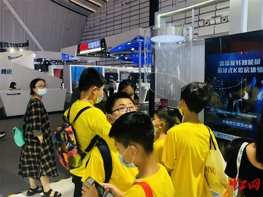 一群学生在体验沉浸式K歌房系统 中工网记者 王天玥摄