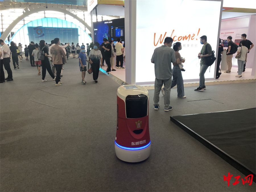图为正在场馆内工作的为观众提供饮料的机器人 中工网记者 王天玥摄