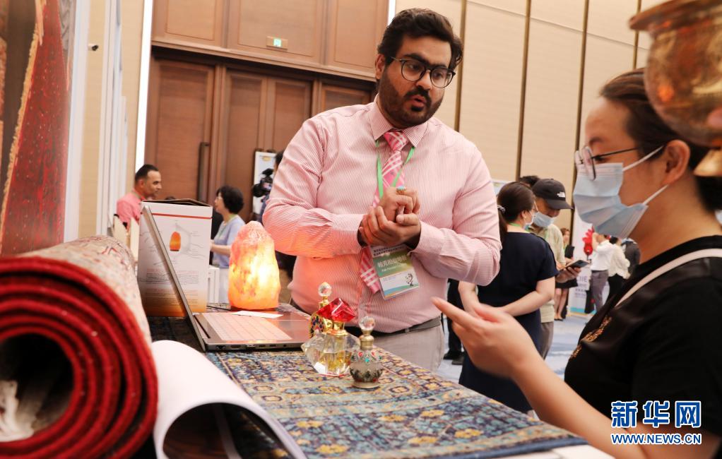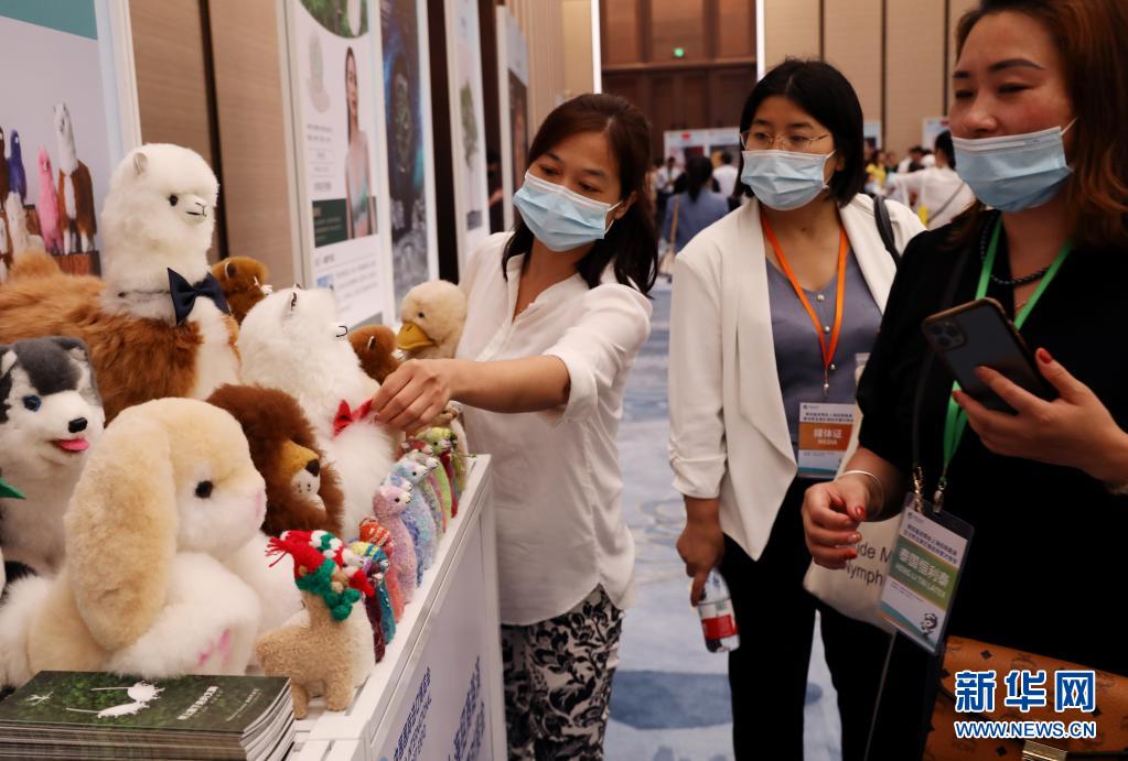 7月15日,参会嘉宾在一家秘鲁羊驼毛制品展位前驻足观看。