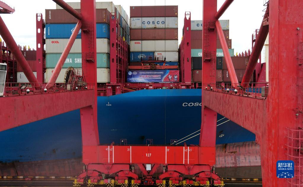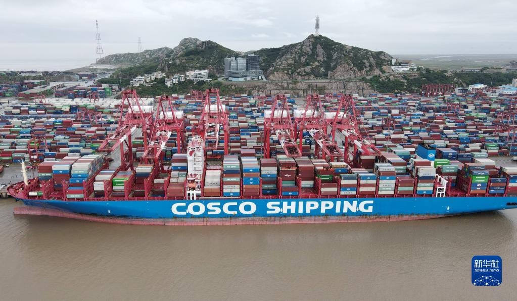 10月13日,中远海运“天秤座”轮停泊在上海洋山港二期码头(无人机照片)。