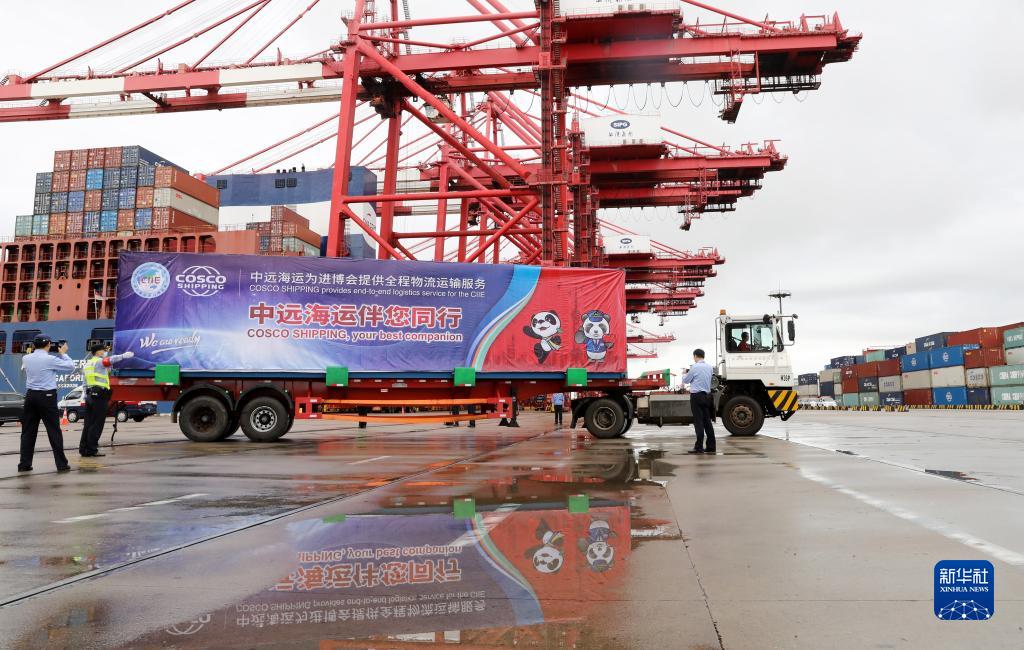 10月13日,装载第四届进博会首批海运展品的集装箱卡车驶离码头。