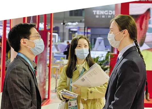 宁波中东欧创新基地工作人员(左一、左二)与进博会参展商展开项目交流 浙江日报记者 王凯艺 摄