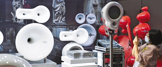 11月6日,参会者在进博会展馆里的意大利PEQUOD公司展位拍摄音响设备。新华社发
