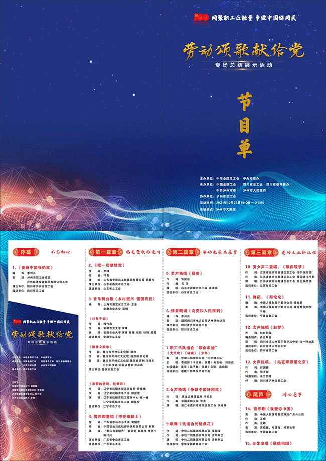 为庆祝中国共产党成立100周年,展现劳动者风采,由全国总工会、中央网信办主办,中国金融工会、四川省总工会、四川省委网信办、中共泸州市委、泸州市人民政府承办,泸州市总工会协办的2021年“网聚职工正能量 争做中国好网民”主题活动之“劳动颂歌献给党”专场总结展示活动于12月23日晚在泸州大剧院举办。