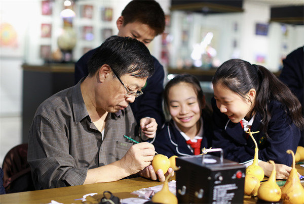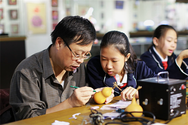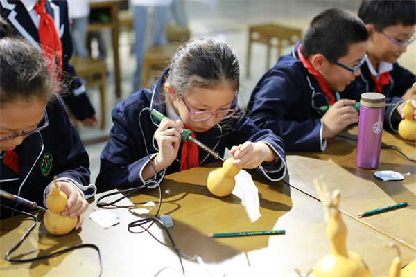 烙画葫芦是用烙铁在葫芦上熨出烙痕作画,烙画葫芦具有悠久的历史和独特的艺术风格。非遗传承人龚老师在教孩子们画葫芦,孩子们被精美的绘画和独特的创作手法吸引,认真学习,创造了自己的作品。