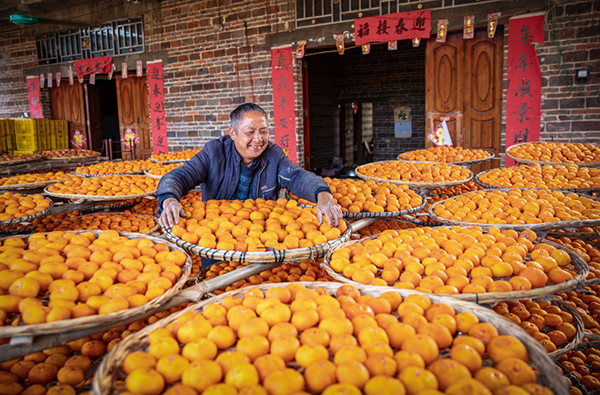 丰收的月柿,更多的是加工晾晒成为的月柿饼。柿民把刨好皮的柿子摆放在竹筛上,经过反复地晾晒、捏压成型,加工成柿饼,平乐二塘镇集镇和乡村居民65%以月柿作为主业,忙碌于月柿的生产、加工和销售,因此过上的“柿柿如意”的甜蜜生活。