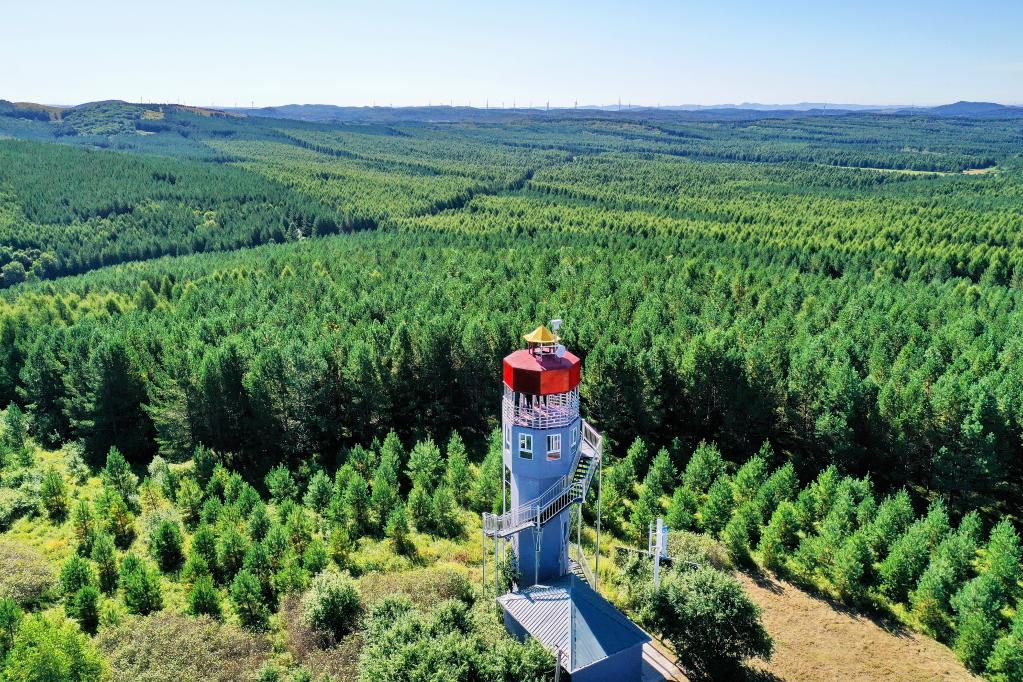 塞罕坝机械林场内的望海楼(2021年8月23日摄,无人机照片)。新华社记者牟宇摄
