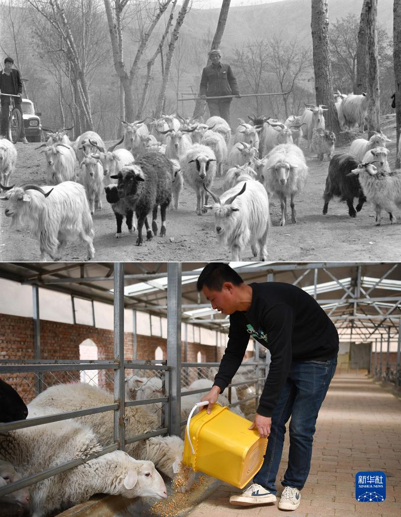 拼版照片:上图为1993年4月27日,陕西省延安市梁村乡的白生有老汉在放养自家的羊群(新华社记者陶明摄);下图为2022年3月29日,延安市安塞区砖窑湾镇西河口村村民苗状在养殖基地里喂湖羊(新华社记者邵瑞摄)。