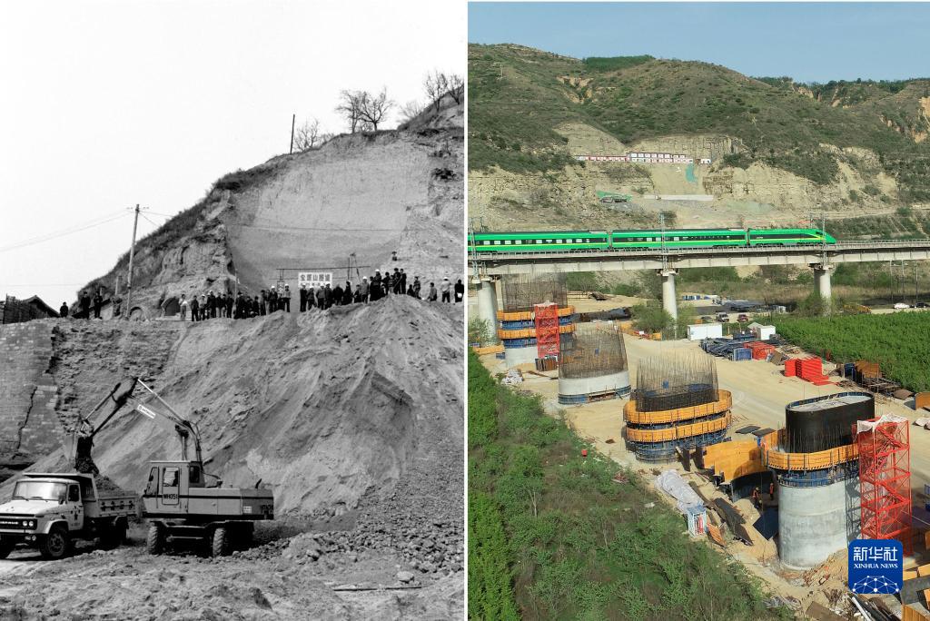 拼版照片:左图为1991年3月30日,通往陕西延安的第一条铁路——西(安)延(安)铁路建设工程紧张进行(新华社记者张喆锋摄);右图是2022年4月25日,施工人员在位于延安市洛川县的西延高铁工地作业,不远处一辆列车行驶在西延铁路上(无人机照片,新华社记者张博文摄)。