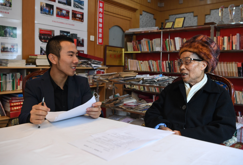 毛秉华(右)生前和孙子毛浩夫学习、探讨井冈山革命历史。新华社记者申宏摄
