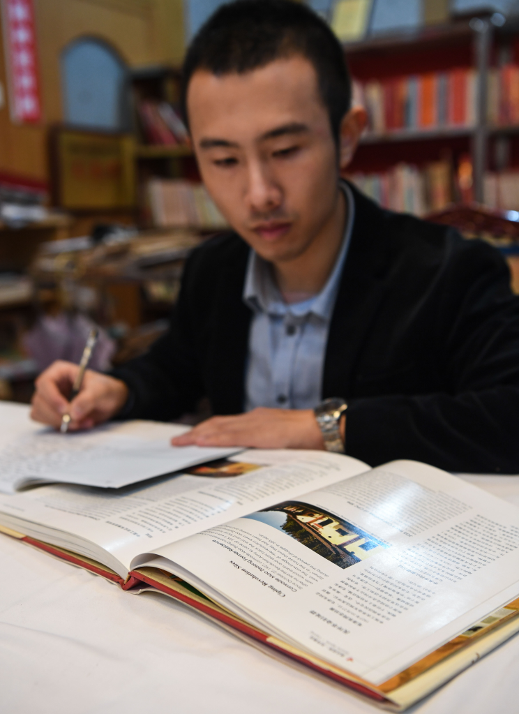 毛浩夫在研读有关井冈山的英文资料,丰富英文讲解素材。新华社记者申宏摄