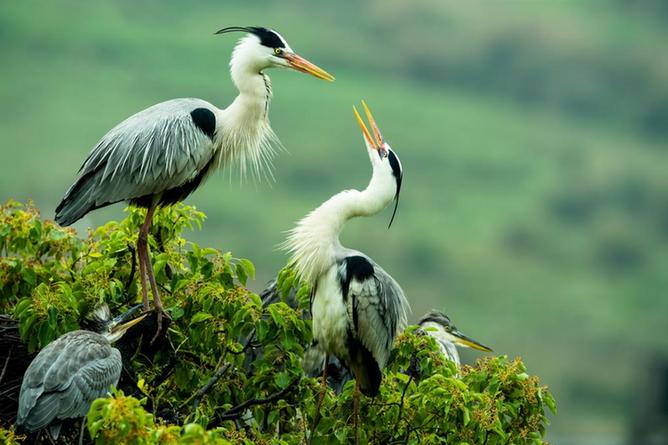 福建省罗源县碧里乡濂澳村后山的树丛中,苍鹭在嬉戏(2022年5月2日摄)。新华社记者梅永存摄