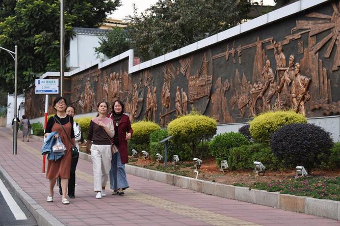 行人走过福建省三明市三钢集团浮雕墙(2020年11月17日摄)。新华社记者姜克红摄