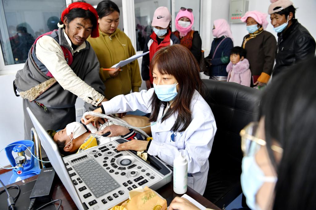 江苏泰州市人民医院援藏医生在拉萨市当雄县人民医院为一名儿童做检查。新华社记者李键摄