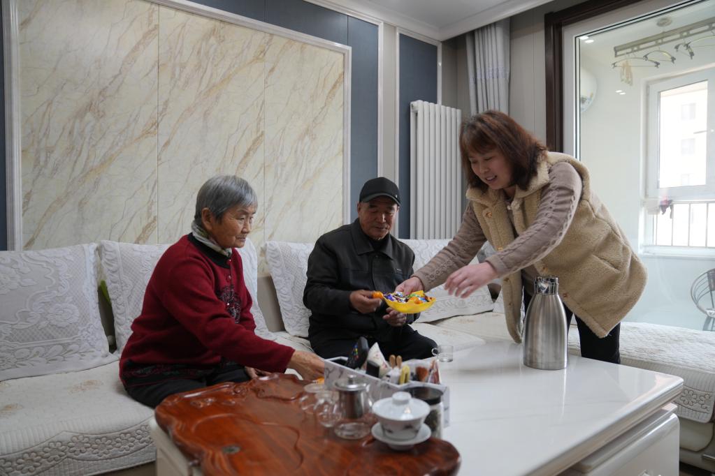 济南市长清区孝里街道居民于家云(中)、朱存红夫妇和儿媳妇安风芹(右)在迁入的新居中。新华社记者朱峥摄