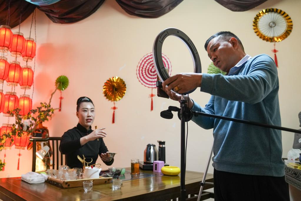 济南市长清区孝里街道居民冯辛华(右)、徐金玉夫妇在自己经营的茶叶店里准备直播。新华社记者朱峥摄
