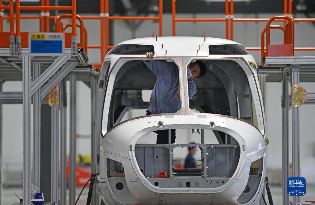 在中国航空工业集团天津直升机有限责任公司车间内,工作人员在进行AC332民用直升机的铆接作业(2022年5月19日摄)。 新华社记者 赵子硕 摄