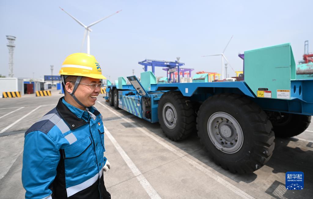 在天津港北疆港区C段智能化集装箱码头,工人参观“水平运输机器人”(2022年4月29日摄)。 新华社记者 李然 摄