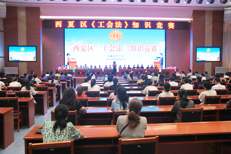 6月23日下午,宁夏回族自治区银川市西夏区总工会在西夏区政府二楼礼堂举办了西夏区“喜迎二十大 奋进新征程”工会法知识竞赛,来自辖区各镇街、法院、检察院、司法局、综合执法局、教育局及辖区企业的16支代表队参加了决赛,近100名职工观看了竞赛。
