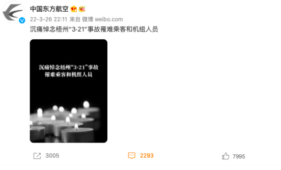 3月26日22时11分,@中国东方航空发布微博:沉痛悼念梧州“3·21”事故罹难乘客和机组人员。