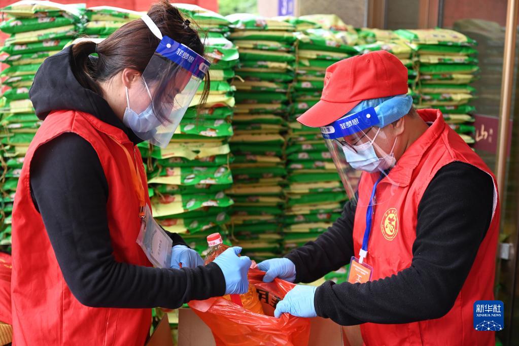 4月1日,在泉州市丰泽区五矿大厦临时打包中转站,志愿者将生活物资打包、装车。