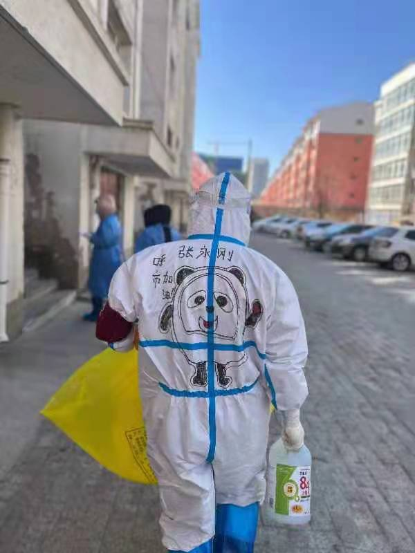 春寒料峭,人们在外面一会就冻得直哆嗦,张永刚却忙前忙后,反复地叮嘱居民间隔1米按顺序排队,并且出示健康码、行程码,同时,帮助年龄大的老人扫码,不一会他防护服里就全是汗水。