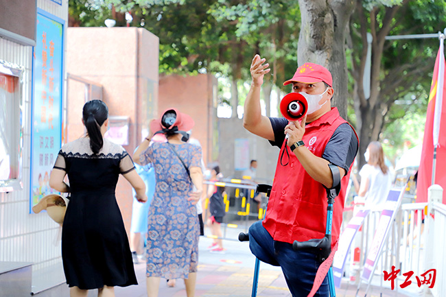 “请大家保持1米距离,别着急,黄码的直接找我!”9月25日,厦门坑内社区核酸检测采集点的通道口,有一位拄着拐杖、手拿喇叭的工会志愿者正在认真地进行秩序维护工作。这位志愿者是省部级劳模、厦门市中途之家爱心助残机构创办人谢启明。