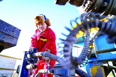 大庆油田1205钻井队钻井工人在野外钻井平台作业。新华社发