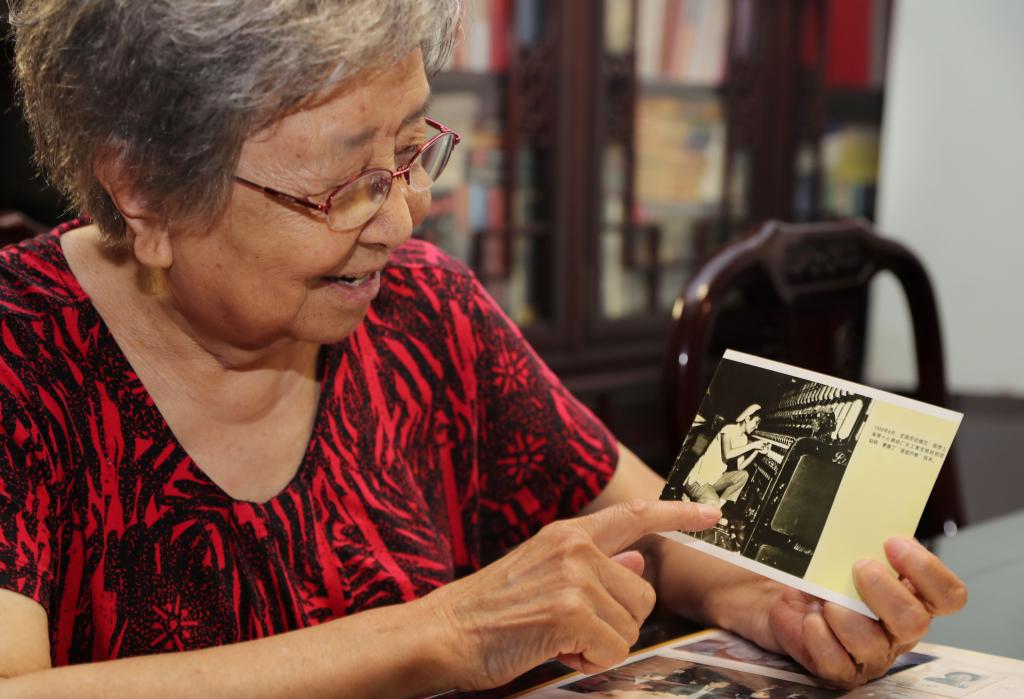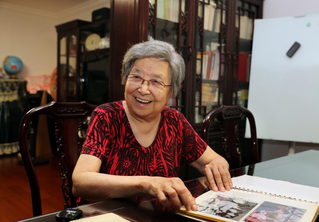 黄宝妹在上海的家中翻看自己做纺织女工时的老照片(2021年6月10日摄)。新华社记者刘颖摄