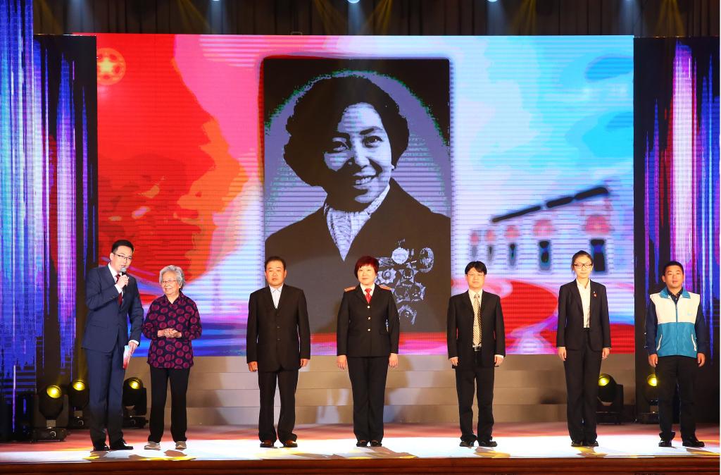 在上海纪念五四运动98周年主题团日活动中,黄宝妹(左二)带领新老青年突击队队员同台亮相(2017年5月4日摄)。新华社记者刘颖摄
