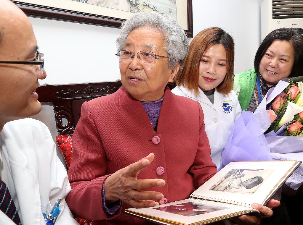 2016年4月27日,黄宝妹(左二)为医务人员讲述当年的工作经历。新华社记者陈飞摄