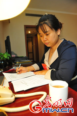 10月17日晚8时,中国工会十六大开幕前夜,在河北省代表团住地,全国劳模杨普正在翻看明日会议议程及相关文件。“这是刚给的大会文件,明天的会上有讨论和发言,我得好好准备一下。”杨普说,这次她是带着任务来开会的,会后她将与同事分享会议所得。