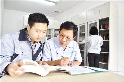 毛玉泉和工作室成员在职工书屋查阅药材资料