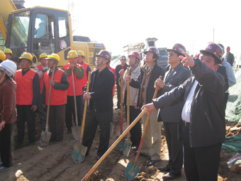 田琦(左3)在工地指挥绿化