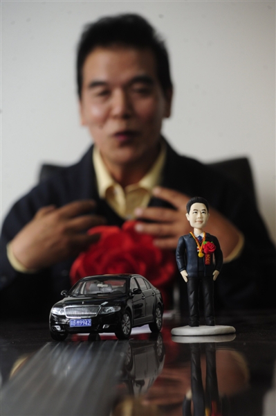 赵长起收到同事们为他准备的退休礼物——车辆和他本人的模型。