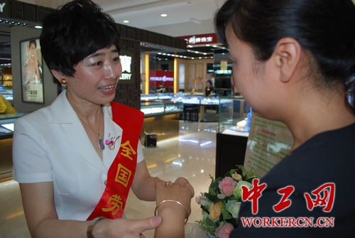 全国劳模杨秀娟给顾客讲解黄金珠宝知识。 张宪军 摄