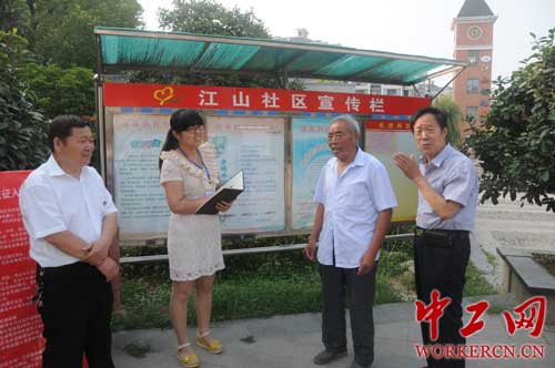 韩金珍与社区老党员在一起交谈,请老党员为社区工作出谋划策。丁彬彬摄影